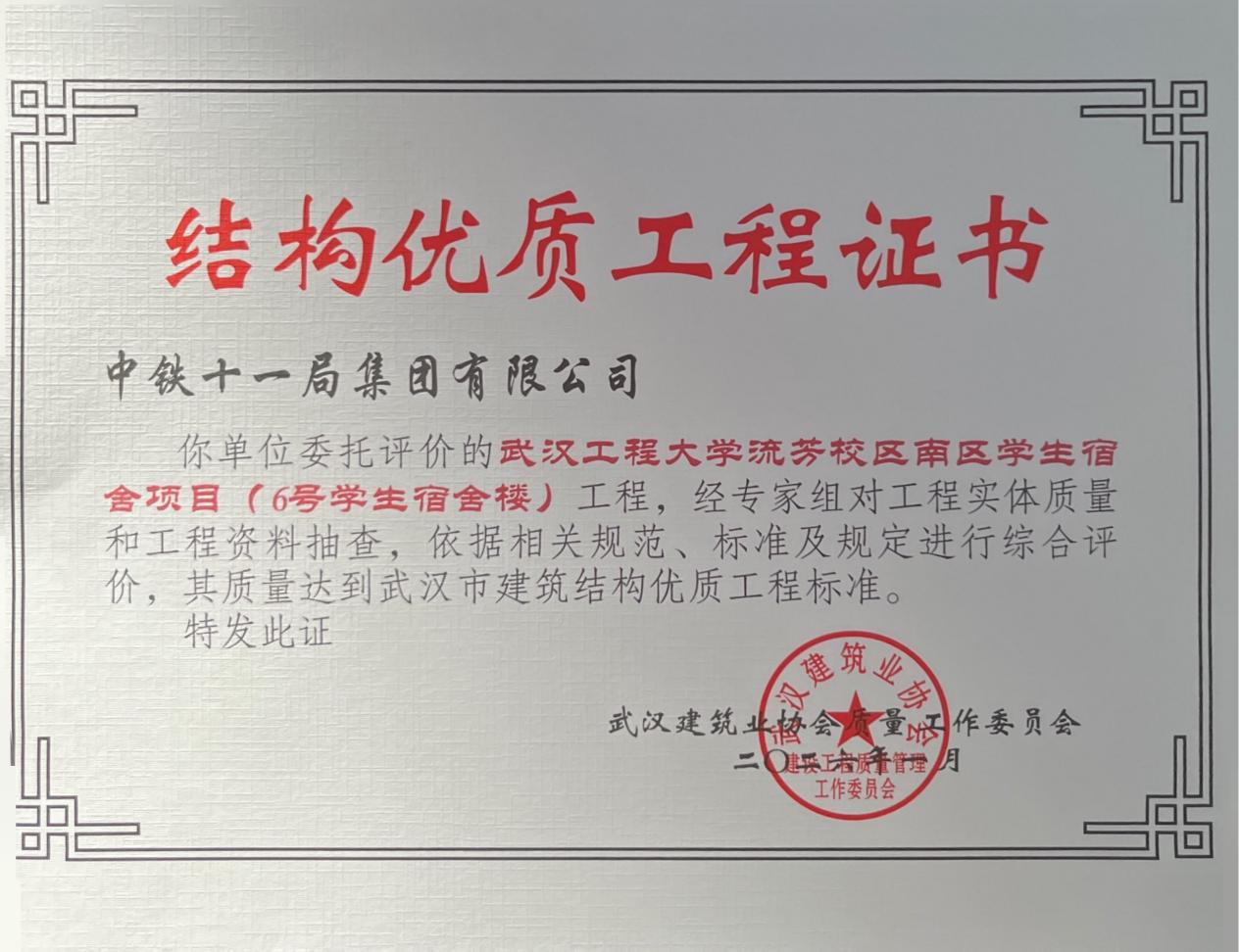 本网讯(通讯员 王子豪)近日,经项目部申请、专家多次现场检查验收、会议集中评审并公示等环节,我校流芳校区南区学生宿舍项目(1、6号楼)凭借精湛的施工工艺、严格的质量管控标准以及过硬的工程品质,成功获评“武汉市建筑结构优质工程”。这一荣誉的获得,标志着该项目在建筑设计、施工工艺、质量管控等方面达到了全市同类工程的先进水平。
